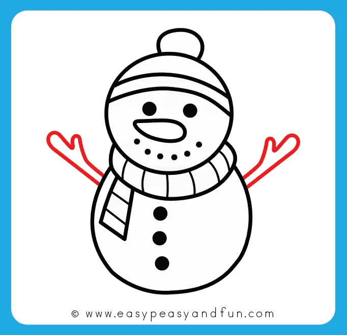 برای دستها میتونی شاخههای خشک بگذاری یا دو تا گلوله برفی بکش. هرچی خلاقانهتر، بهتر!