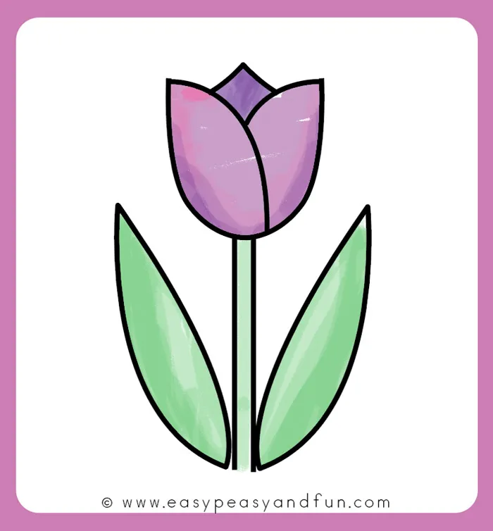 در آخر، گل لالهتان را با رنگهای دلخواه — مثل بنفش، قرمز یا زرد — رنگآمیزی کنید.