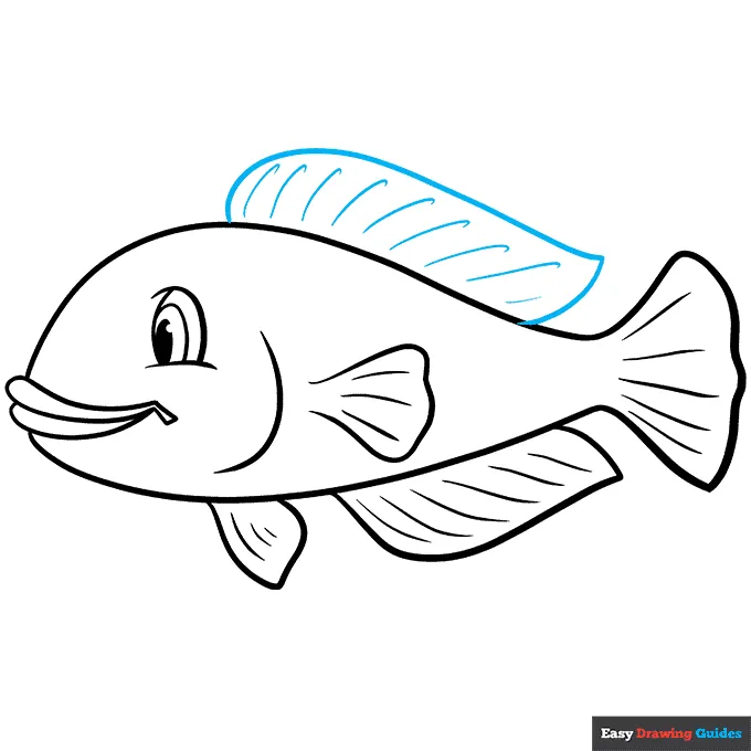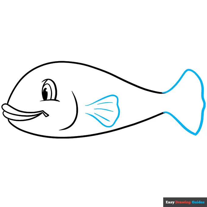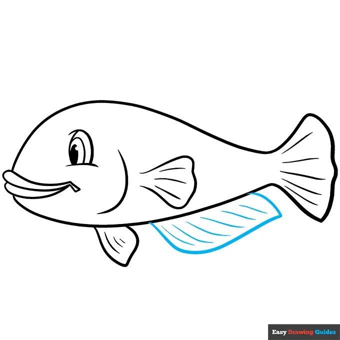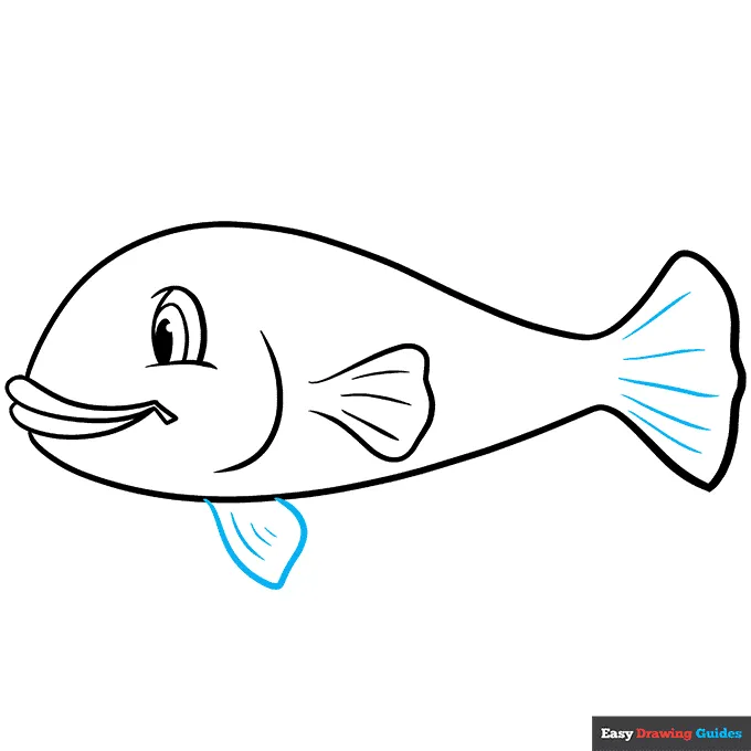 زیر بدن ماهی هم یه بالهی دیگه با خط خمیده بکش و با چند خط کوتاه روش بافت بده.