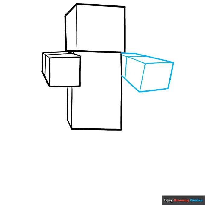 برای دست، یه جعبه کج بکش که کمی با فاصله از بدن باشه. بعدش با سه خط مورب و یه خط صاف اون رو به بدن وصل کن. داخل دست هم دو تا خط بکش برای جزئیات بیشتر.