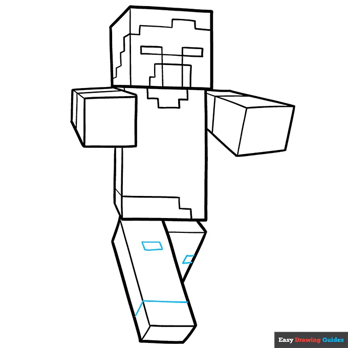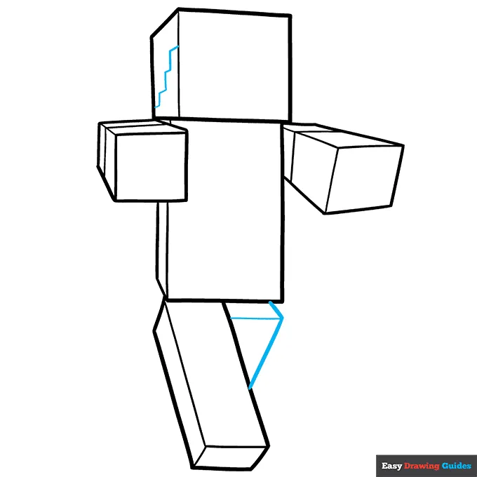 بریم سراغ پاها! دو تا خط مورب بلند بکش و پایینشون رو با یه خط صاف بهم وصل کن. مثل مرحلههای قبل دورش رو با خطهای صاف کامل کن.