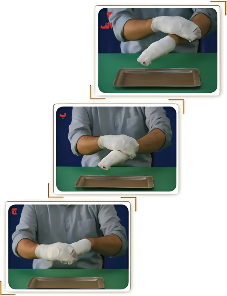 مرحله چهارم: کشیدن کف دست چپ به تمام پشت دست راست و بعد از آن کشیدن کف دست راست به تمام پشت دست چپ.