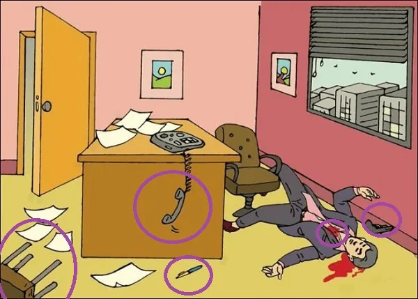 ۳. مرد مرده چپ دست است زیرا تمام وسایل او مانند خودکارها و تلفن در سمت چپ است اما اسلحه در سمت راست است (کسی اسلحه را آن جا گذاشته است)
