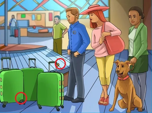 چمدان سمت چپ مربوط به خانم لباس سبز است که قلاده سگش را به دست دارد. اگر دقت کنید، جای چنگ و خراش سگ روی چمدان افتادهاست.