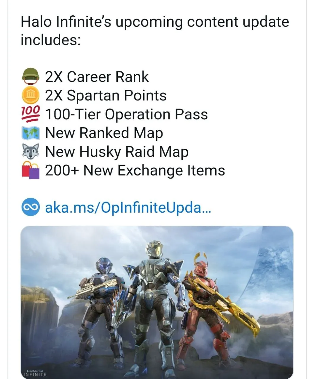 بهروزرسانی Operation Infinite پیشرفت در Career Rank و دریافت Spartan Points را دو برابر سریعتر خواهد کرد. همچنین یک Operation جدید، بیش از ۲۰۰ آیتم در بخش Exchange، نقشههای جدید برای حالت رنک و موارد بیشتر از طریق این آپدیت به بازی اضافه خواهند شد.