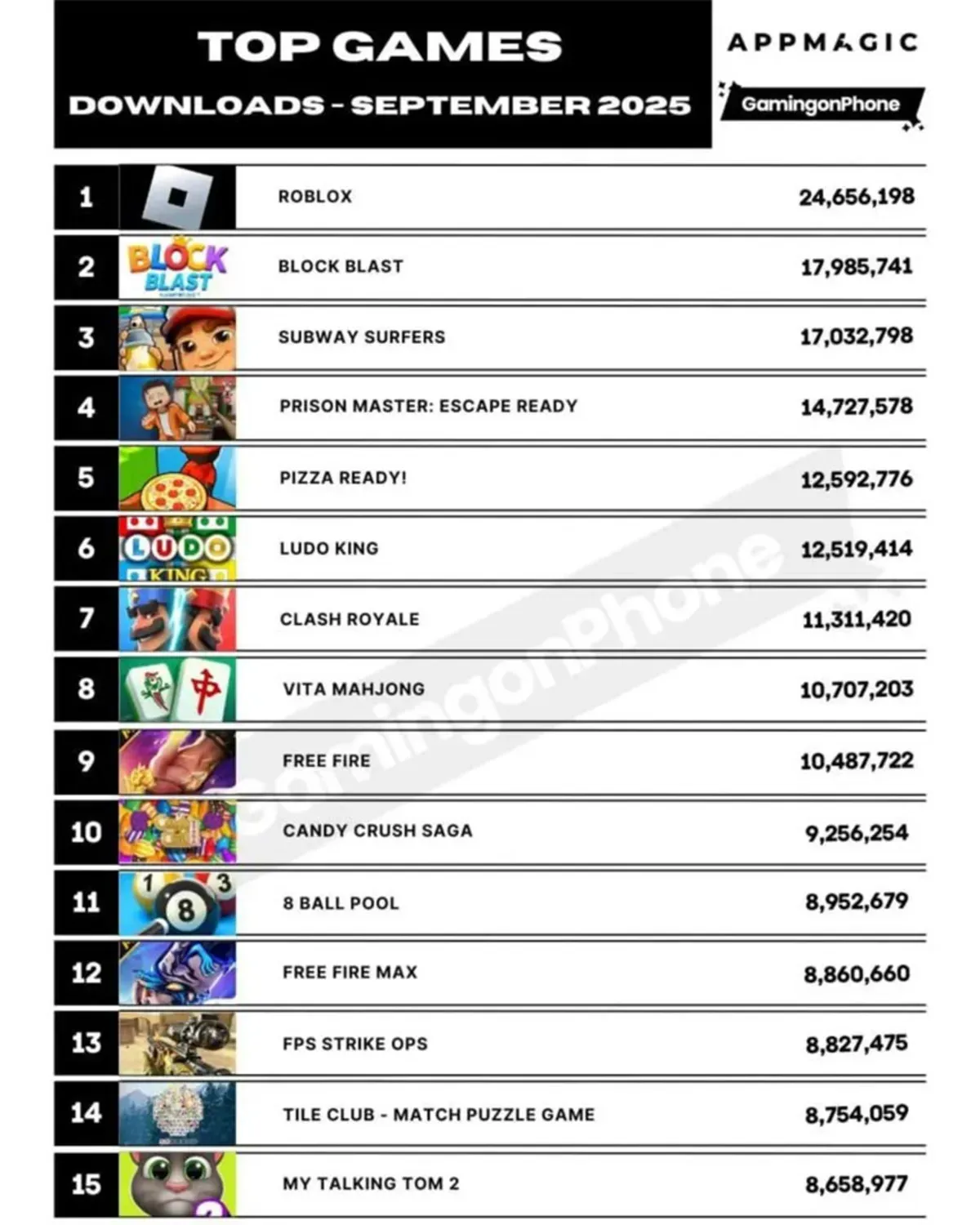 Roblox با ۲۴.۶ میلیون دانلود، رتبه اول را بهدست آورد و جذابیت بینظیر خود را در میان مخاطبان جوان و خلاق نشان داد. بازی Block Blast با ۱۷.۹ میلیون نصب در رتبه دوم قرار گرفت و همچنان بهعنوان یکی از اعتیادآورترین بازیهای پازلی سال شناخته میشود.