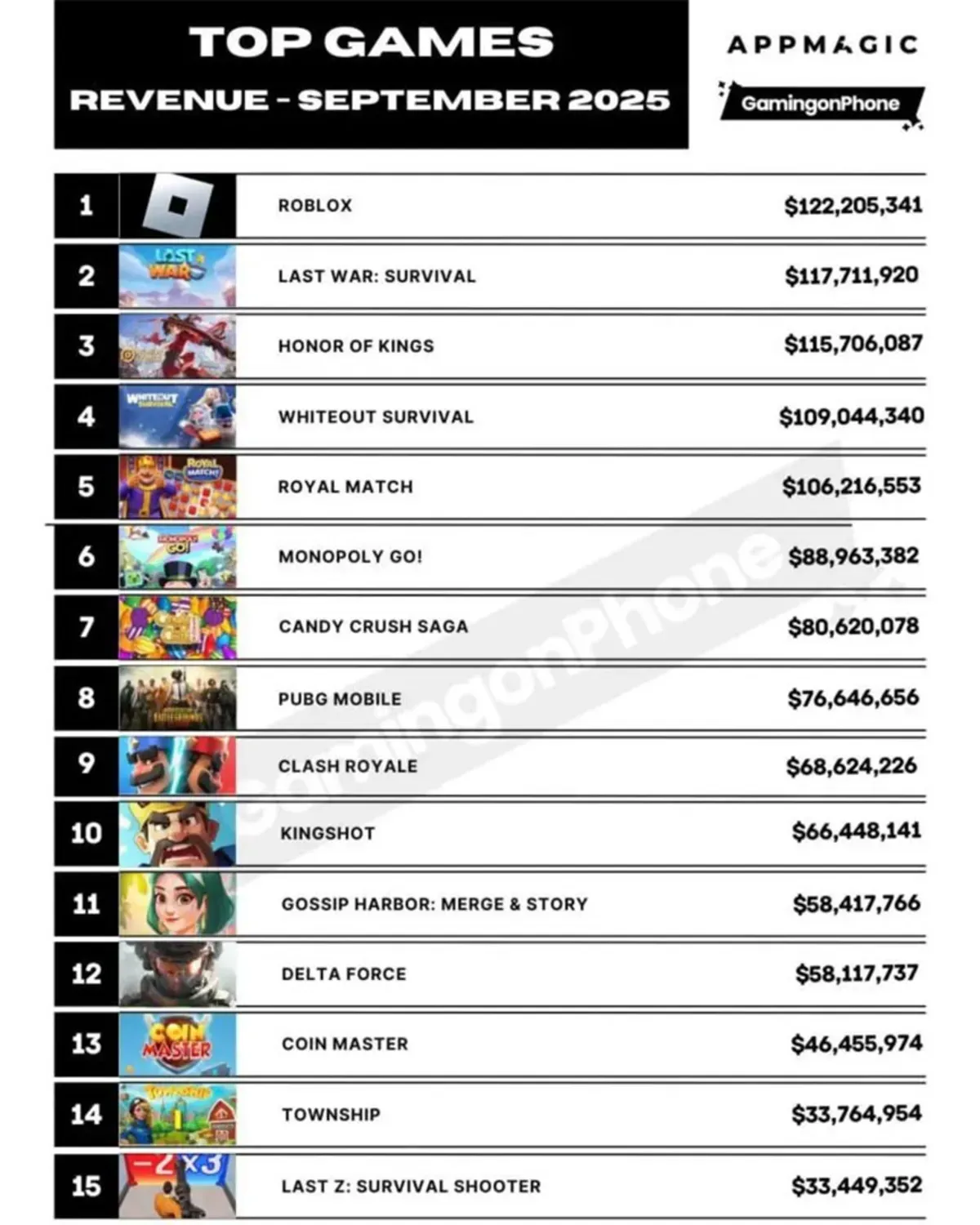 از نظر درآمدزایی، شاهد پادشاه جدیدی در فهرست بودیم. روبلاکس با ۱۲۲.۲ میلیون دلار درآمد، در صدر قرار گرفت. بازی Last War: Survival با ۱۱۷.۷ میلیون دلار، در رتبه دوم ایستاد و ماه قدرتمند دیگری را برای این ترکیب استراتژی-بقا رقم زد.