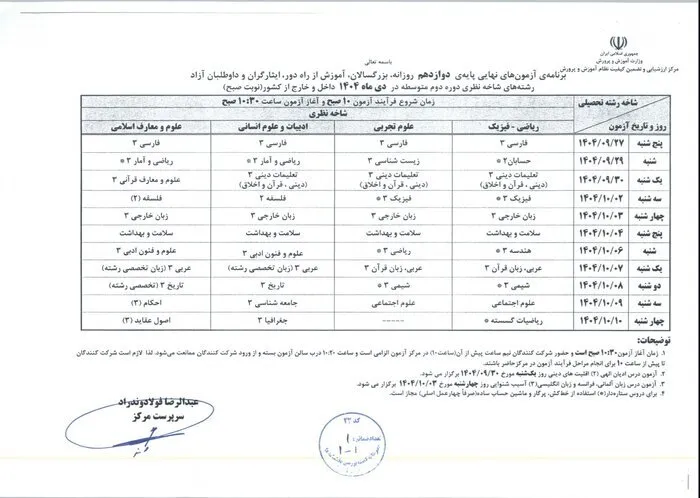 برنامه آزمون نهایی پایه دوازدهم روزانه، بزرگسال آموزش از راه دور ایثارگران و داوطلب آزاد رشتههای شاخه نظری دوره دوم آموزش متوسطه در نوبت دی ماه سال تحصیلی ۱۴۰۵-۱۴۰۴ اعلام شد.