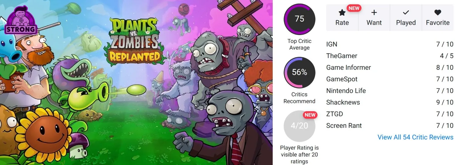 Plants vs. Zombies: Replanted کاملترین نسخه از این بازی استراتژیک کلاسیک است. گیمپلی آن ساده و قابل فهم اما چالشبرانگیز است و فرمول آن امروز هم به همان اندازه قدرتمند است که ۱۶ سال پیش در زمان انتشار اولیهاش بود. ارائه کلی بازی کاملاً بینقص و یکپارچه است و تعداد زیاد حالتهای بازی تضمین میکند که مدتی طول بکشد تا بتوانید به طور کامل تمام محتوای آن را کشف کنید.