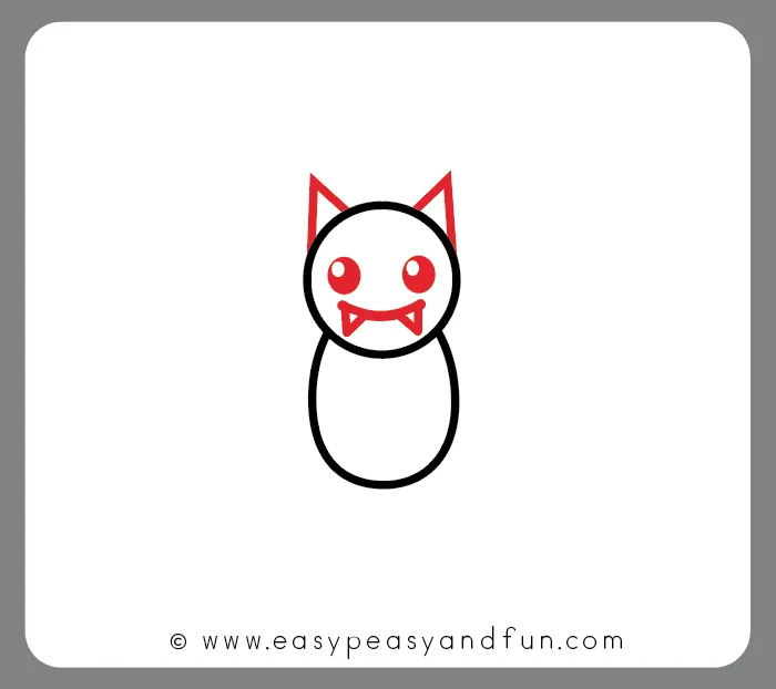 دو مثلث کوچک نوکتیز برای گوشها روی بالای دایره بکش. سپس صورت را با چشمهای ساده (دو دایره کوچک)، یک بینی کوچک و یک لبخند یا دندونهای کوچک تکمیل کن.