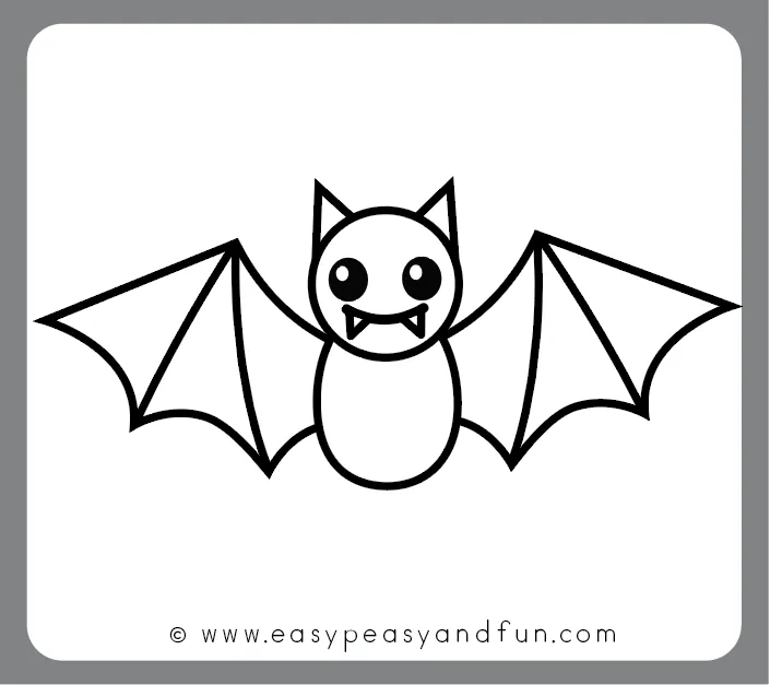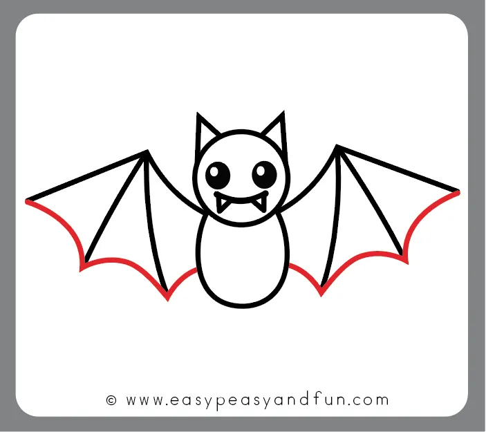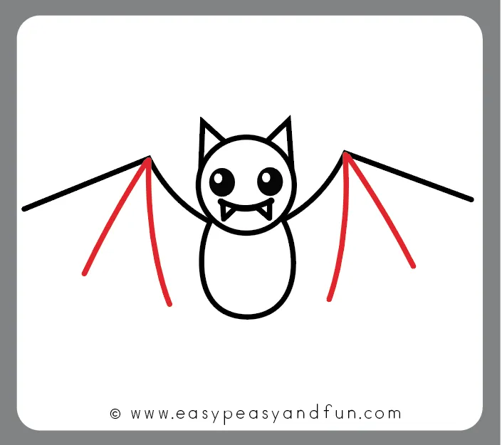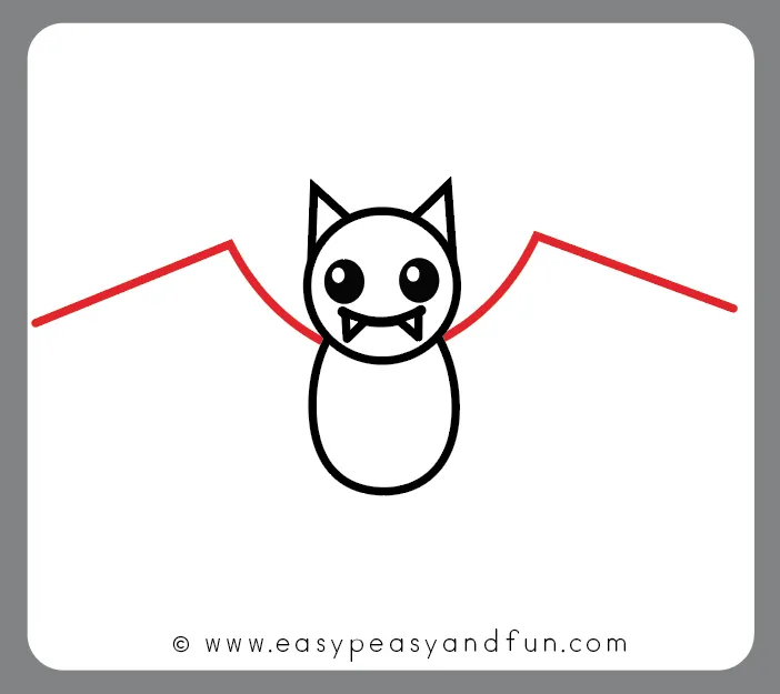از دو طرف بدن، خطهای منحنی بکش تا بالها شروع شوند — بال خفاش شبیه یک نیمدایره با فرو رفتگیهای نرم بین انگشتان است.