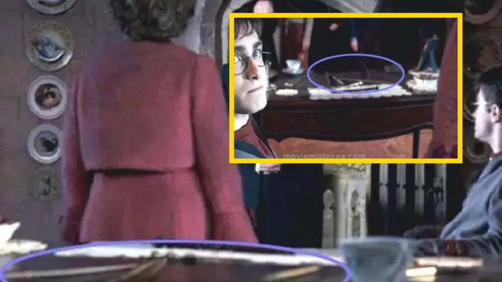 وقتی آمبریج چوبدستیهای هری و دوستانش را مصادره میکند، در هر برداشت جای آنها روی میز تغییر میکند — گاهی کنار هم هستند و گاهی پراکنده، حتی یکی از آنها روی زمین دیده میشود!